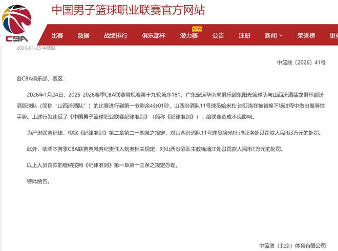 针对此事,CBA公司在赛后,也是进行了调查,最终,CBA认定在第一节比赛,还有4分01秒时,迪亚洛在被换下场之后,做出了“侮辱性手势”,这样的行为,违反了CBA的规则,对CBA联赛,造成了不良的影响。